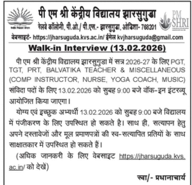 PM Shree Kendriya School Jharsuguda Recruitment 2026,  TGT, PGT, Yoga Coach recruitment board inviting Online Application For 09 post vacancy 2026, interested and eligible candidates are apply Walk-in-interview on the official website. For More Details Read Full Job Post. Get latest Government Jobs 2026.
