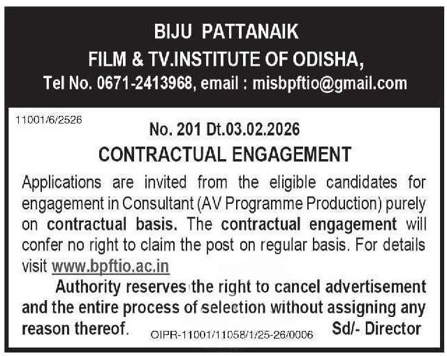 Biju Patnaik Film and Television Institute of Odisha Recruitment 2026, Consultant (AV Programme Production) recruitment board inviting Online Application For 01  post vacancy 2026, interested and eligible candidates are apply online on the official Website. For More Details Read Full Job Post. Get latest Government Jobs 2026.