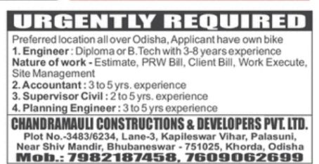 Chandramauli Construction & Developers PVT.LTD. Odisha Private Jobs 2026 | |