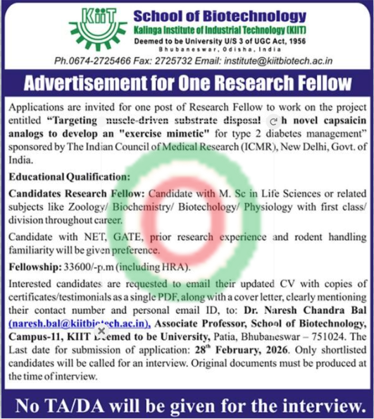 KIIT School of Biotechnology inviting applications for one Research Fellow to work on ICMR sponsored project titled “Targeting muscle-driven substrate disposal: novel capsaicin analogs to develop an ‘exercise mimetic’ for type 2 diabetes management.” Interested candidates fulfilling eligibility criteria must send updated CV along with certificates in single PDF through email. Only shortlisted candidates will be called for interview. Original documents must be produced at interview time.