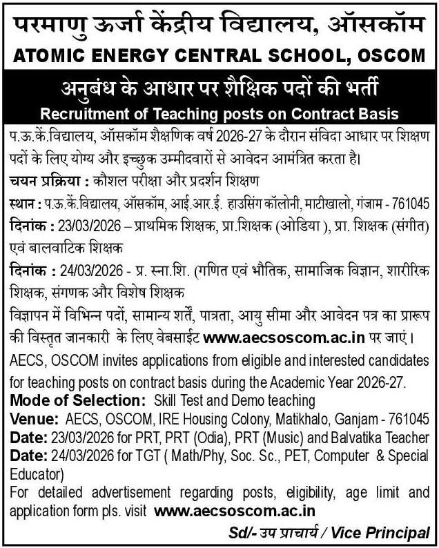 AECS OSCOM Ganjam Recruitment 2026, TGT/PRT recruitment board inviting Online Application For 10 post vacancy 2026, interested and eligible candidates are apply the walk-in-interview 23.03.2026 to 24.03.2026 on the official website . For More Details Read Full Job Post. Get latest Government Jobs 2026.