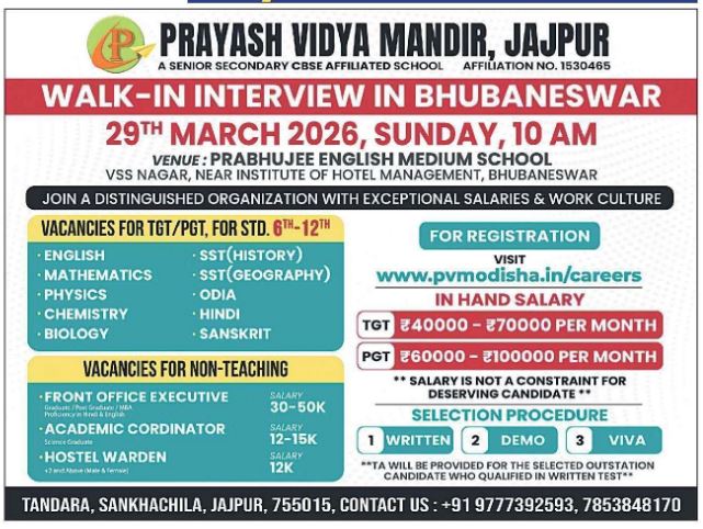 Prayash-Vidya-Mandir Jajpur Recruitment 2026, Teaching/Non-Teaching Post recruitment board inviting Online Application For 13 post vacancy 2026, interested and eligible candidates are apply online on the official website . For More Details Read Full Job Post. Get latest Government Jobs 2026.