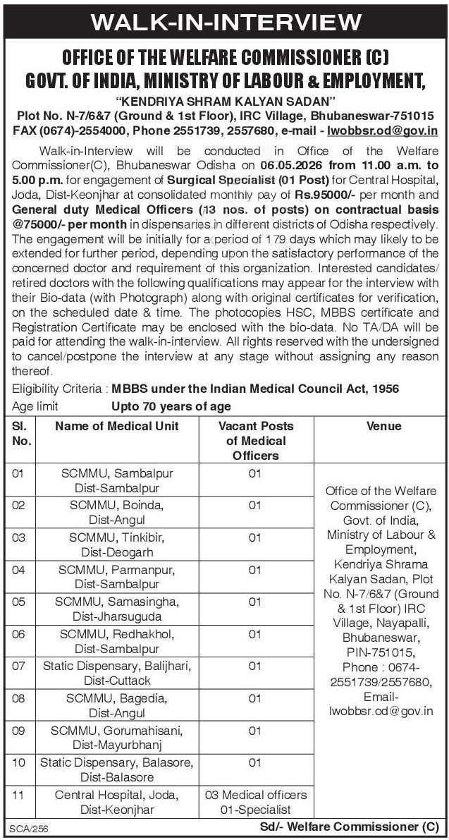 Labour Welfare Commissioner Odisha Recruitment 2026, Surgical Specialist, General Duty Medical Officers (GDMO) recruitment board inviting Online Application For 14 post vacancy 2026, interested and eligible candidates are apply online on the official website. For More Details Read Full Job Post. Get latest Government Jobs 2026.