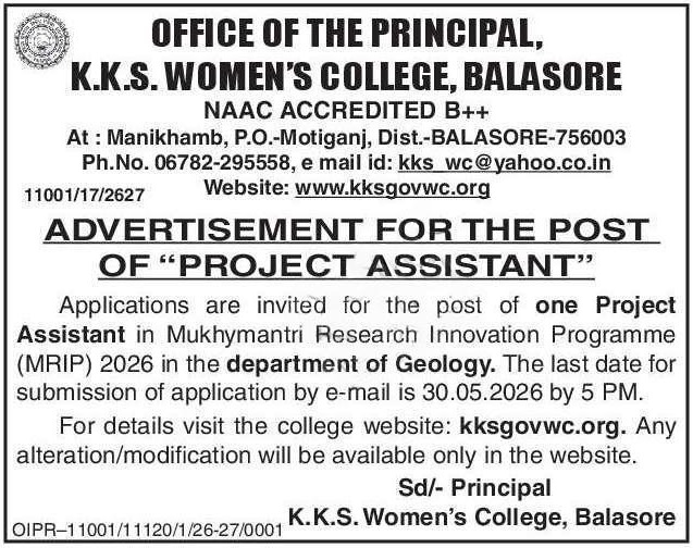 K.K.S. Women’s College Balasore Recruitment 2026, Project Assistant recruitment board inviting Online Application For 01 post vacancy 2026, interested and eligible candidates are apply online on the official website. For More Details Read Full Job Post. Get latest Government Jobs 2026.